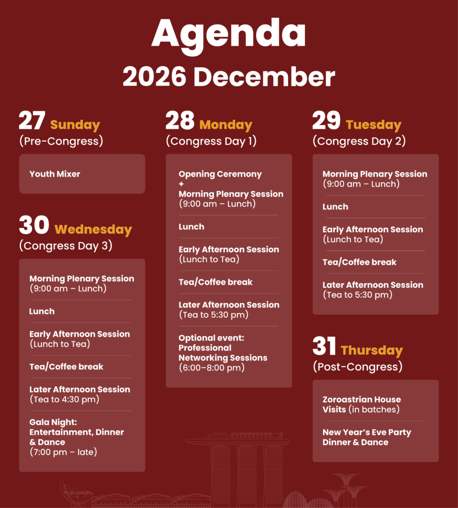 The Congress will bring together voices from Zoroastrian communities worldwide to celebrate our shared culture and heritage. It will offer many chances to connect collaborate, and build lasting friendships.